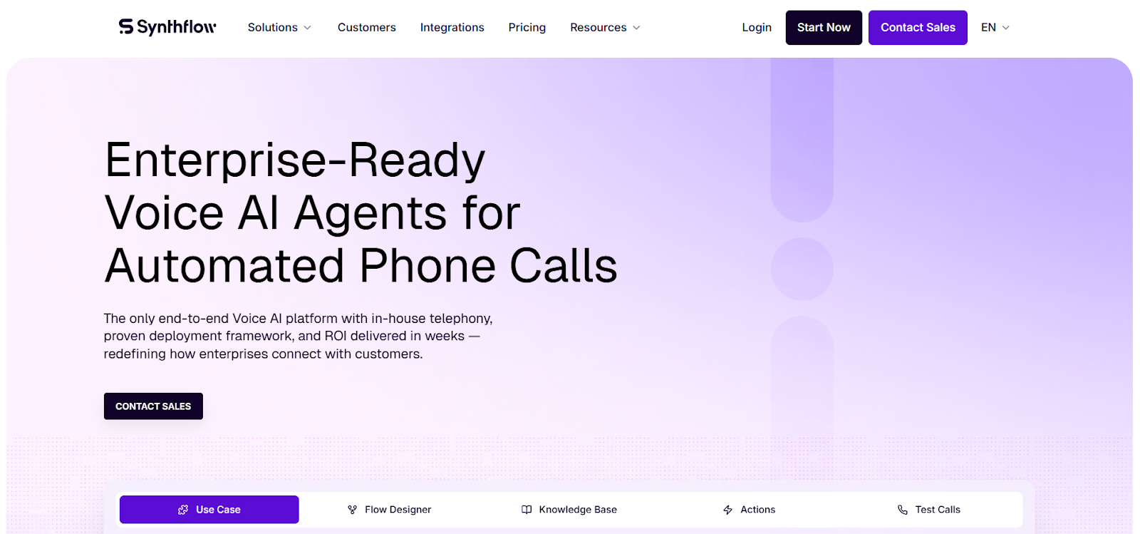 Synthflow is a no-code platform designed for rapid deployment of AI voice agents, with built-in telephony and workflow tools. It targets teams that want to launch call automation quickly without deep engineering involvement. This makes it appealing for initial deployments or simpler use cases, but introduces limitations as systems scale in complexity.