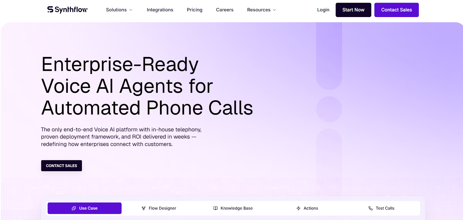 Inside Synthflow, you build AI agents using a visual flow designer, define the steps of your call logic, connect APIs or CRMs, and test workflows before going live. Its framework aims to make voice agent design intuitive so teams can scale from simple scripts to more advanced actions like transfers, bookings, and webhook integrations. Because the platform also handles telephony routing and monitoring, businesses don’t need to stitch together separate services just to automate calls with a single voice agent.