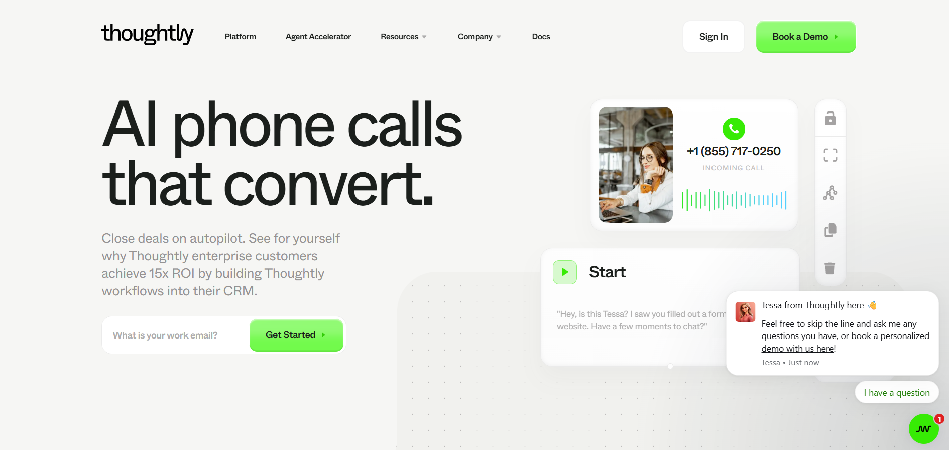 I built and deployed a lead follow-up agent in Thoughtly's drag-and-drop editor in about 15 minutes. The platform is laser-focused on sales use cases: lead qualification, appointment setting, and automated follow-up. CRM integrations with Salesforce and HubSpot worked cleanly, and the agent booked meetings directly into Calendly during test calls. Thoughtly claims businesses using their agents see up to 117% increases in appointments set, which tracked with my experience on warm leads. The voice sounded natural enough for short sales calls (2-3 minutes).
