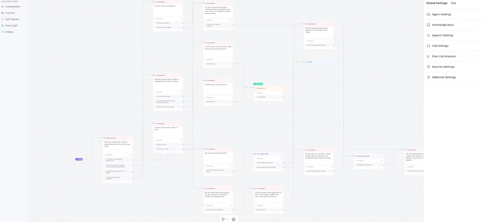Use Retell's no-code visual builder to create multiple nodes to handle different scenarios in conversations, enabling you to handle more complex scenarios with predictable outcomes.