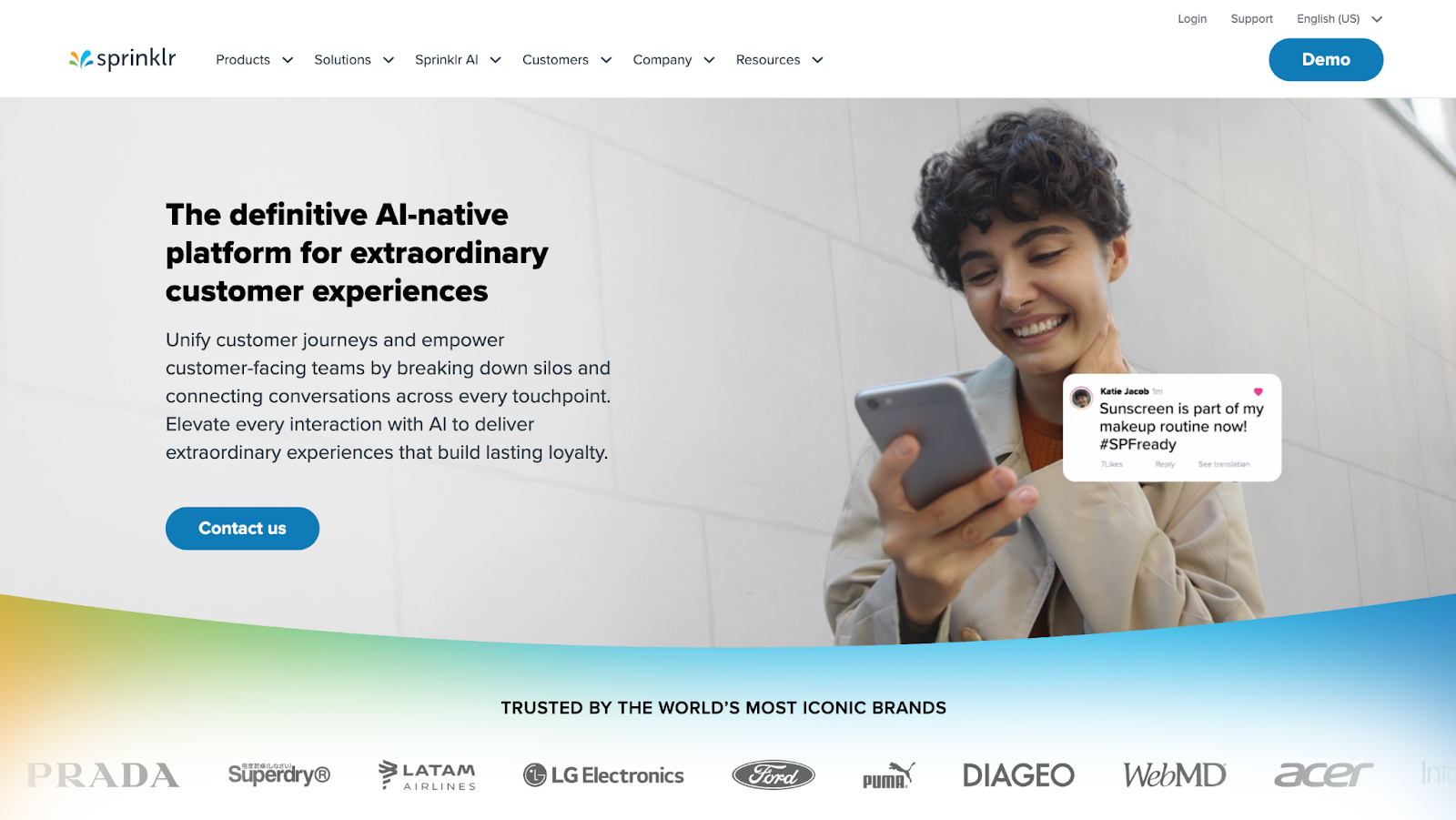 Sprinklr shows up fast when large brands talk about conversational AI platforms. It is an AI-native CX platform that pulls social, messaging, email, web chat, and voice into one place, then layers automation, routing, and analytics on top.
