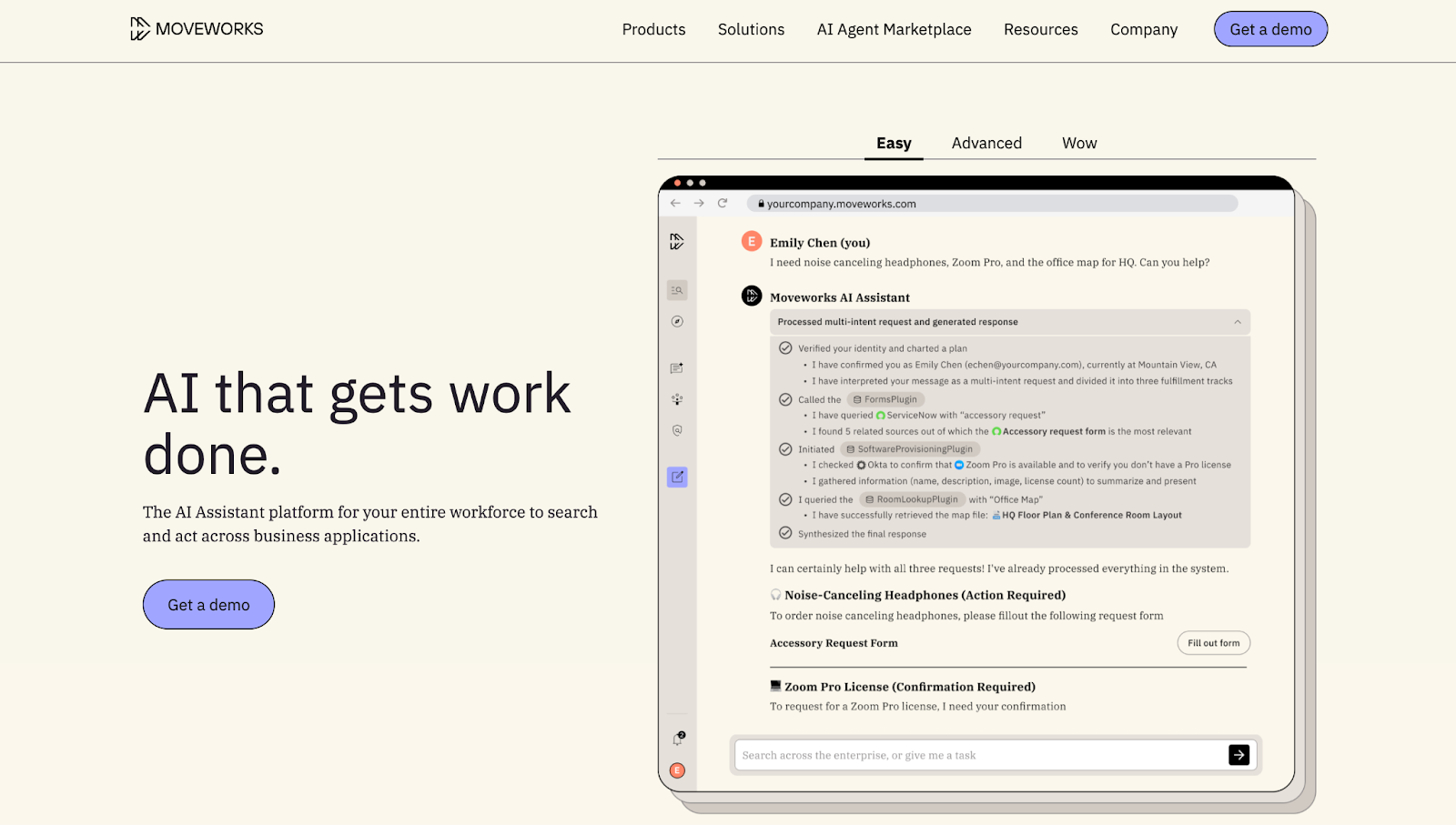 Moveworks is a conversational AI platform built for internal support, not customer service. Its AI agents sit inside Slack, Microsoft Teams, and web portals, understand natural language, and resolve IT, HR, and finance requests by talking to your existing enterprise systems instead of just sending links.