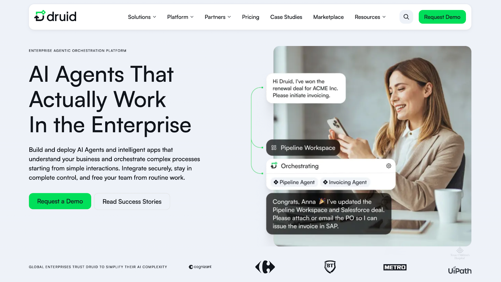 DRUID AI focuses on agentic AI for enterprises. It sits on top of existing systems and RPA, so AI agents can talk with people, pull data, and trigger workflows in tools like UiPath, CRMs, and core business apps.