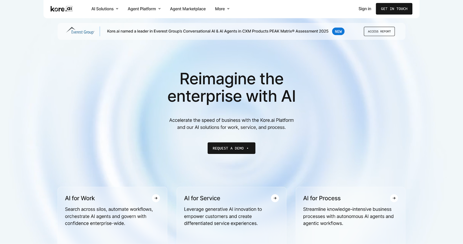 Kore.ai sits in the “all in one” category of conversational AI platforms. It gives you AI agents for customer service, employee support, and operations on the same stack.