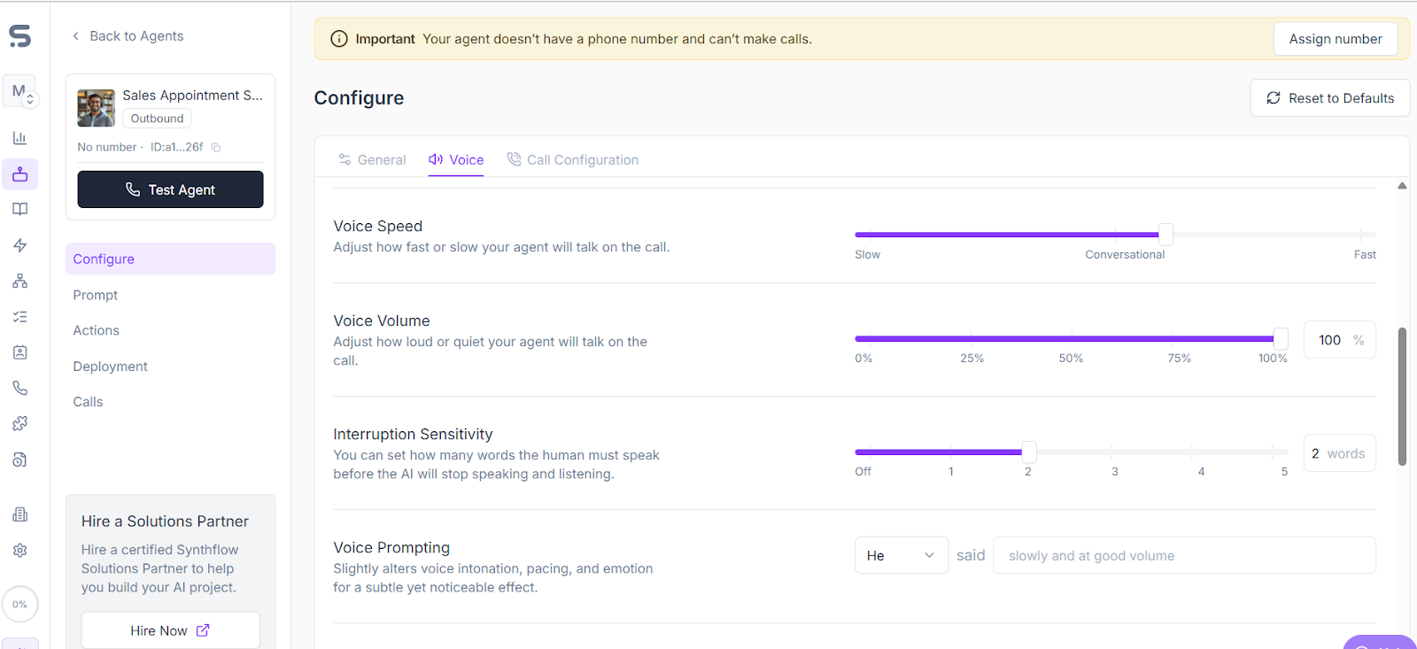 The biggest advantage of Sythflow AI is its no-code platform with a drag-and-drop interface that makes launching voice agents quick and easy. You can define different actions to happen before, during, or after a call.