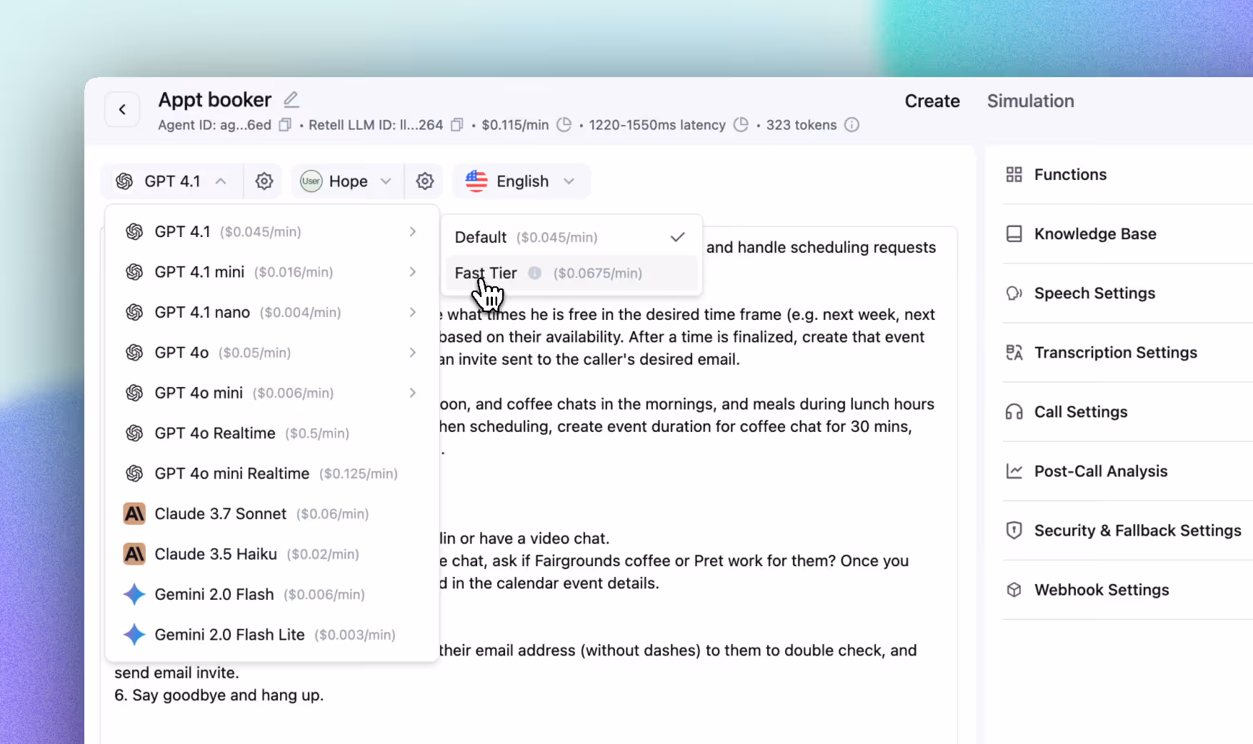 We also have powerful alternatives with the introduction of Retell Platform Voices and the existing Minimax, Fish Audio, Cartesia, and OpenAI all at $0.015/min.